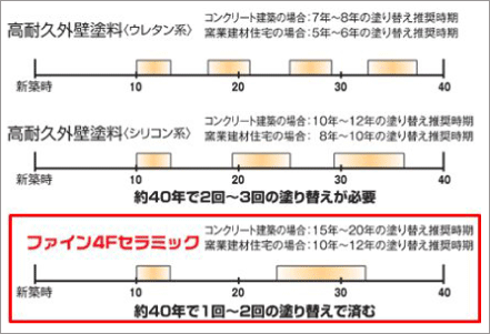 下の図は、一般的な建物の寿命を40年とした時の塗り替え回数の目安です。ウレタンやシリコン塗料にくらべてファイン4Fセラミックは約40年の間に2回の塗り替えで済む計算になります。
